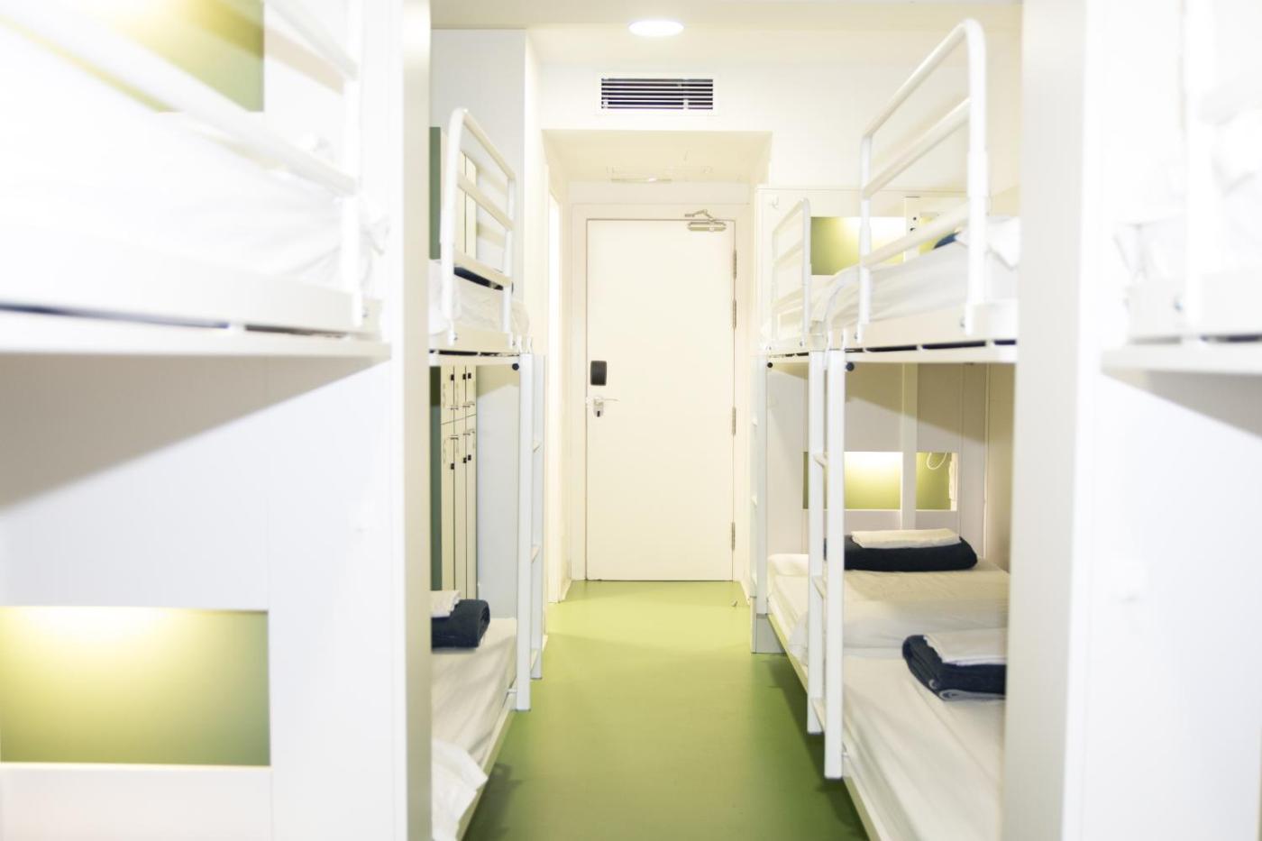 Habitación Compartida Mixta de 8 camas. Esta habitación compartida mixta cuenta con 4 literas, taquillas con cerradura, cabeceros individuales, lámparas de lectura, estaciones de carga y aire acondicionado.